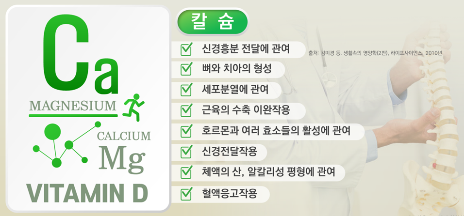 - 칼슘은 뼈·치아 구성, 비타민D는 흡수 보조