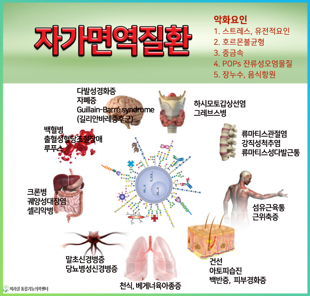 자가면역질환은 면역 시스템이 외부 침입자가 아닌 자신의 조직을 공격하는 질환입니다. 대표적으로 루푸스, 류마티스 관절염, 다발성 경화증 등이 있으며, 그 중심에는 **면역계의 오작동과 염증**이 존재합니다.