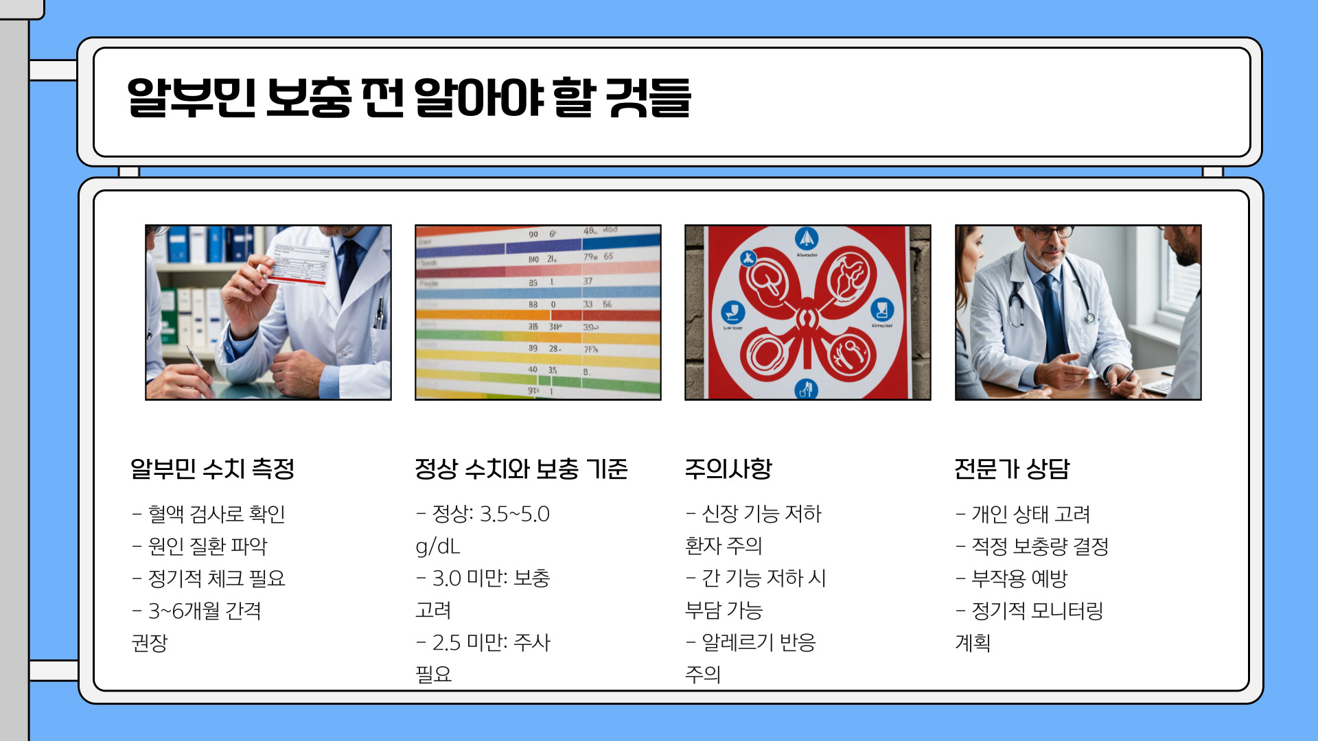 알부민은 단순한 단백질을 넘어서 우리 몸의 건강 지표 역할을 합니다. 정상 수치를 유지하면 체액 균형과 면역력을 지킬 수 있지만, 부족하면 질환의 전조가 될 수 있습니다. 따라서 고단백 식품과 적절한 보충제를 활용해 균형을 유지하는 것이 중요합니다. 단, 보충제는 어디까지나 보조 수단일 뿐이며 기본은 균형 잡힌 식단, 규칙적인 생활습관, 정기적인 건강검진입니다. 오늘부터는 작은 습관을 쌓아 알부민 수치를 관리하고, 건강한 삶의 기초를 다져 보세요.
