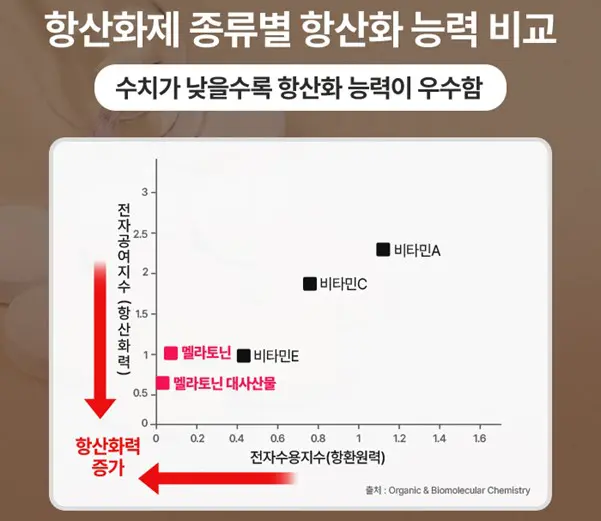 이때 활성산소의 공격을 막는 물질이 바로 **항산화제(Antioxidant)**입니다. 비타민C, 비타민E, 셀레늄, 폴리페놀 등이 대표적인 항산화 성분이며, 멜라토닌도 이 항산화제들 중 가장 **강력한 작용**을 보이는 물질 중 하나입니다.
