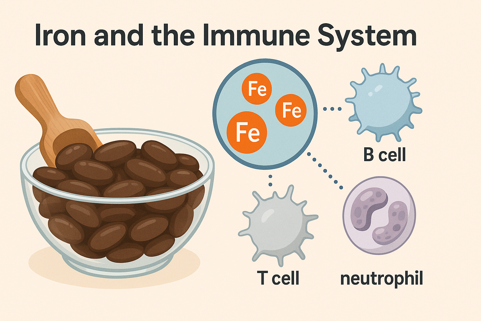 철분은 T세포, B세포 등 림프구의 성숙과 기능에 영향을 줍니다. 대식세포(macrophage)의 세균 제거 능력에 필수적이며, 철분이 부족할 경우 백혈구의 수가 줄어들고, 이로 인해 면역 반응이 약화됩니다. 또한 염증 반응을 조절하는 사이토카인 분비에도 철분이 영향을 주어, 과도한 염증 또는 면역 억제 상태를 방지하는 데 기여합니다.
