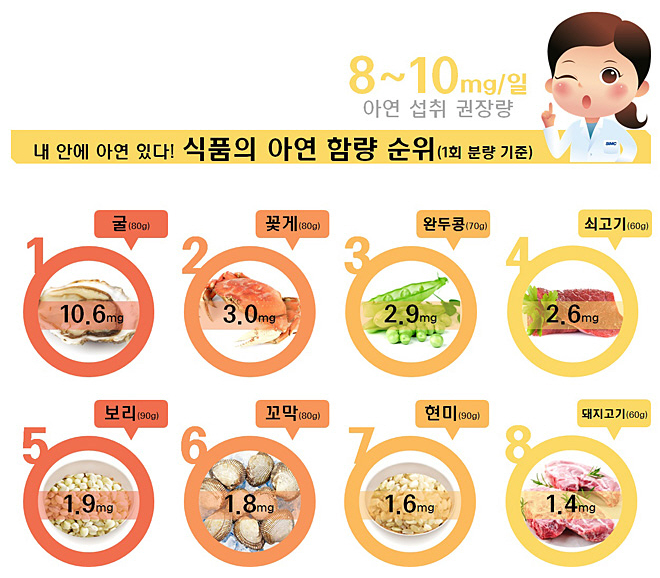 아연은 주로 육류, 해산물(특히 굴), 견과류, 통곡물에 풍부합니다. 성인의 경우 하루 권장량은 남성 10mg, 여성 8mg 정도이며, 과량 복용 시 오히려 구리 흡수를 방해할 수 있으므로 주의가 필요합니다. 비타민 C, 단백질과 함께 섭취하면 흡수율이 높아지며, 철분, 칼슘과는 간격을 두고 섭취하는 것이 좋습니다.